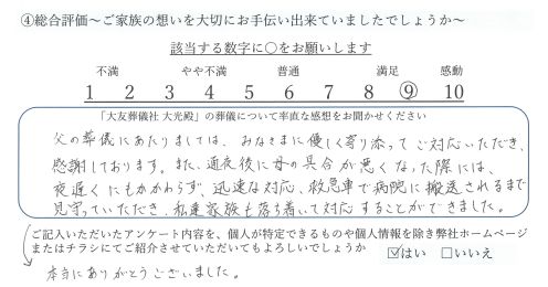 ー父の葬儀にあたりましては、みなさまに優しく寄り添ってご対応いただき感謝しております。また、通夜後に母の具合が悪くなった際には、夜遅くにもかかわらず、迅速な対応、救急車で病院に搬送されるまで見守っていただき、私達家族も落ち着いて対応することが出来ましたら本当にありがとうございました。