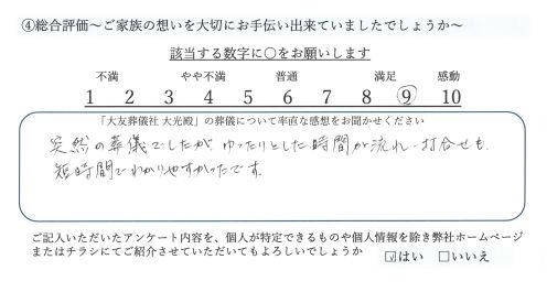 ー突然の葬儀でしたが、ゆったりとした時間が流れ、打合せも短時間でわかりやすかったです。