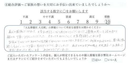 ー義父の葬儀につきまして、大変お世話になりありがとうございました。遺族の思いを汲み取り、親切、丁寧に対応してくださったスタッフのみなさんに大変感謝しております。家族が亡くなることが初めての経験で分からないことが多く不安でしたが、病院のお迎えから葬儀後の過ごし方まで一つ一つ丁寧に教えてくださり、安心しました。義父とのお別れの場を大光殿にお願いして本当に良かったと思います。ありがとうございました。